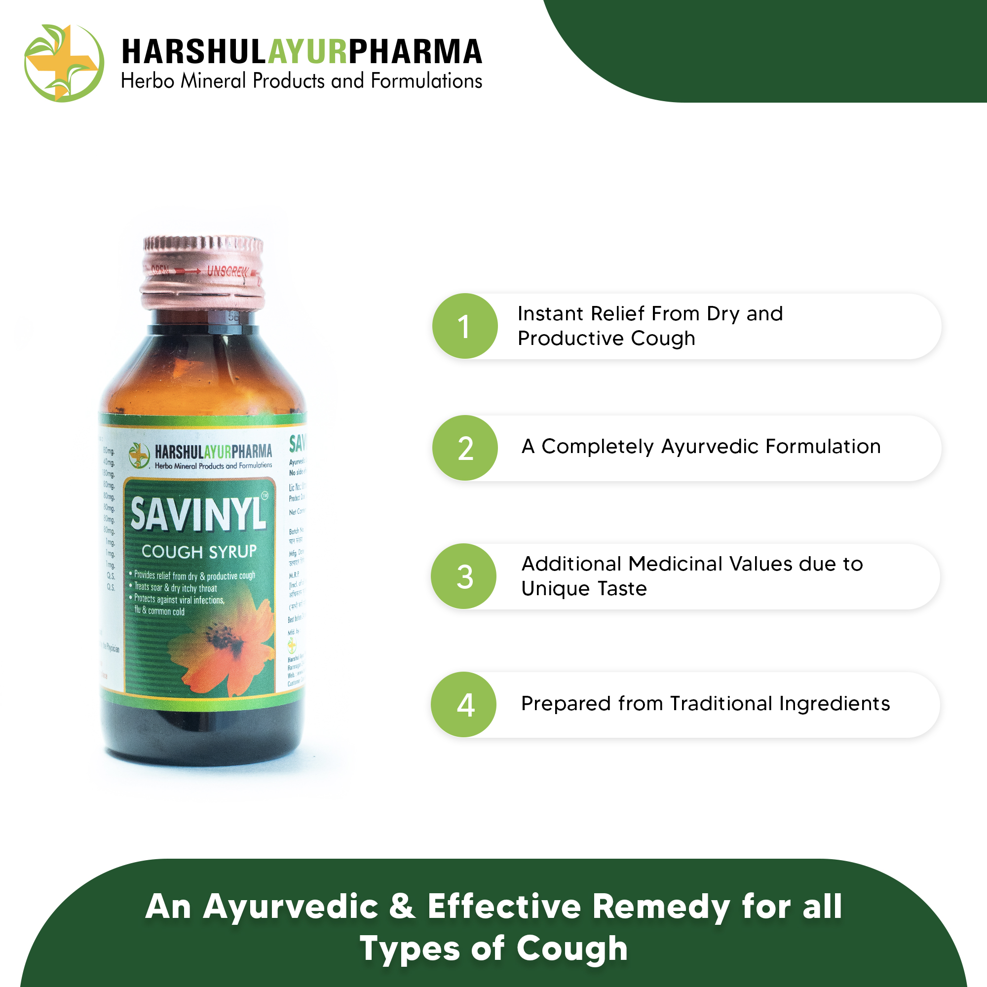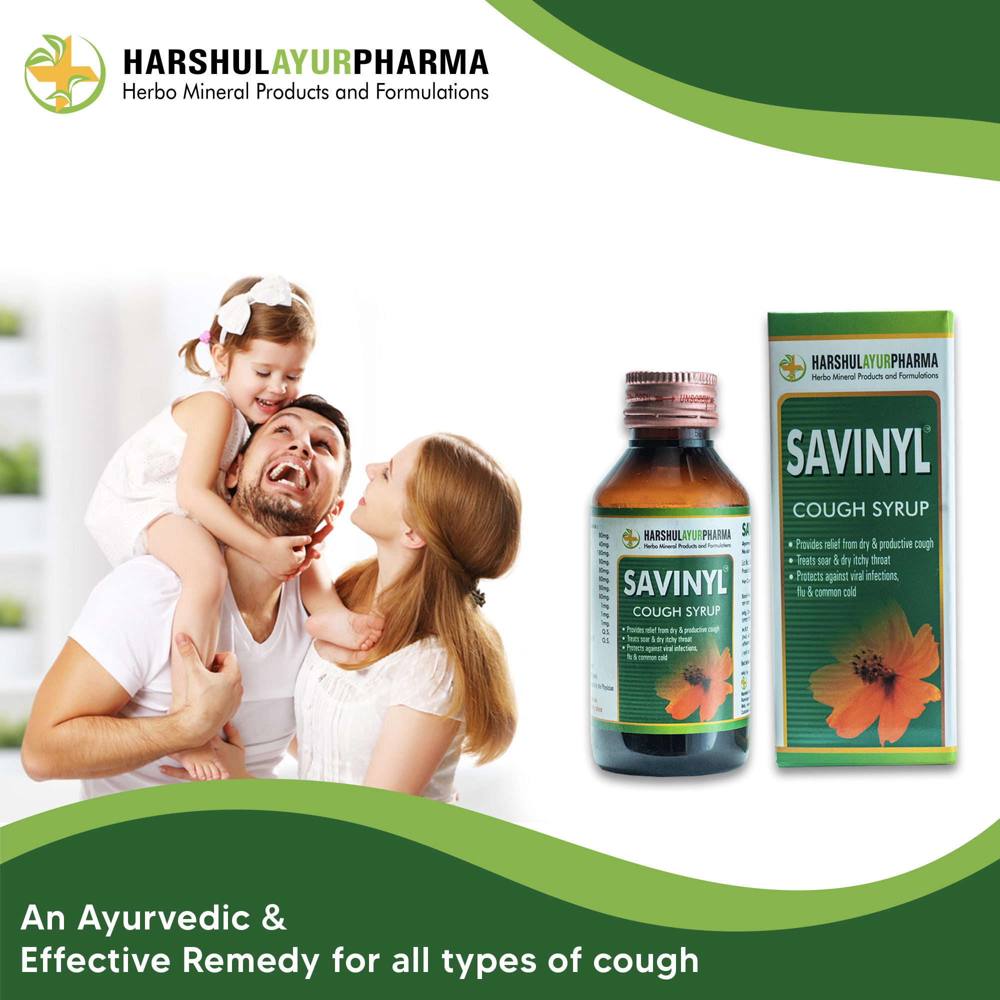 SAVINYL is completely Ayurvedic and non-alcoholic cough syrup which effectively provides instant relief from dry and productive cough. The unique taste of the cough syrup separates it from other options available in this category and has additional medicinal values for treating soar and dry itchy throat. Formulated by the combination of traditional herbs and ingredients, the herbal cough syrup also helps protecting against viral infections, flu and common cold.